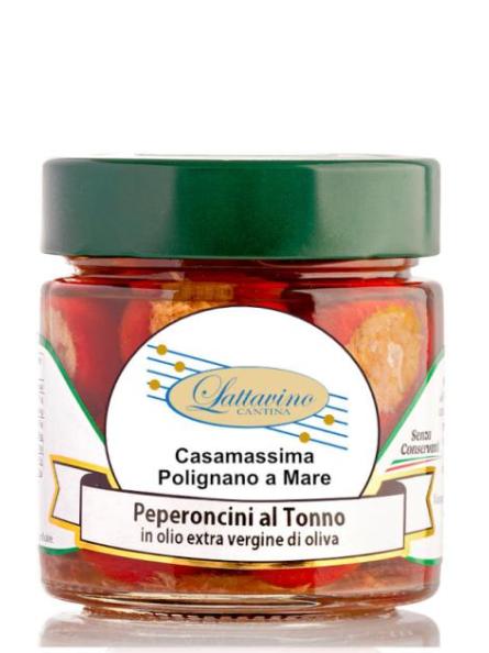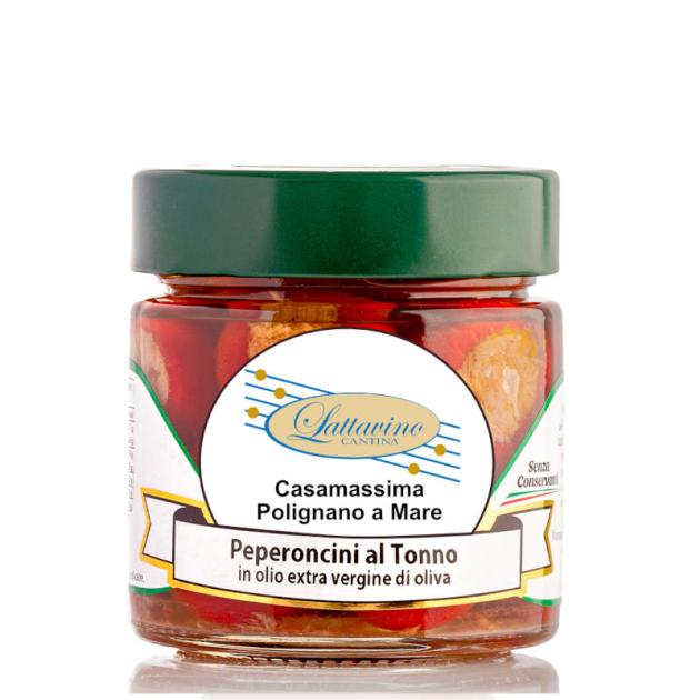 INGREDIENTI Peperoncini piccanti (50.0 g), tonno in olio di oliva (tonno, olio di oliva, sale) (39.9 g), olio extravergine di oliva (27.5 g), capperi, aceto di vino, sale, zucchero.