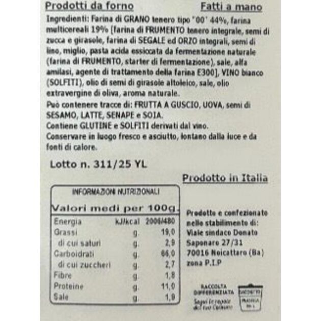 Farina di GRANO tenero tipo "00" 44%, farina multicereali 19% (farina di FRUMENTO tenero integrale, semi di zucca e girasole, farina di SEGALE ed ORZO integrali, semi di lino, miglio, pasta acida essiccata da fermentazione naturale (farina di FRUMENTO, starter di fermentazione), sale, alfa amilasi, agente di trattamento della farina E300), VINO bianco (SOLFITI), olio di semi di girasole altooleico, sale, olio extravergine di oliva, aroma naturale.