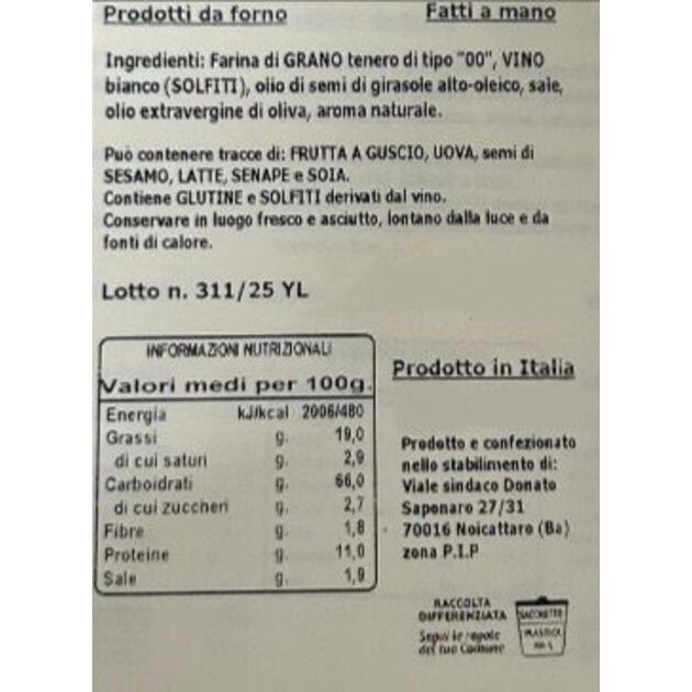 Farina di GRANO tenero tipo "00", VINO bianco (SOLFITI), olio di semi di girasole alto-oleico, sale, olio extravergine di oliva, aroma naturale.